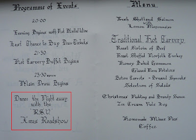 How long RSV continued to operate after this I don’t know. I suspect that, with the drawdown happening around 2000, the end must have been quite soon after that last photo. Diminishing numbers and access to other forms of entertainment would have lessened the need for RSV (multi-channel TV for example, when I arrived there was just one channel).One aspect of RSV I haven’t mentioned until now is the provision of “Discos” at Unit functions. Throughout its existence RSV provided a pool of DJs, equipment and music which helped support many a function. Whether it was supporting a band or being the main source of music, the RSV Discos were booked to functions in all the Messes and occasionally were in demand off station. On more than one occasion they provided the entertainment at beach parties. The 2 pictures below show an RSV Disco in the NAAFI (date unknown but probably in the 70’s) and part of the programme for the Officers’ Mess Christmas Draw in 1993.
